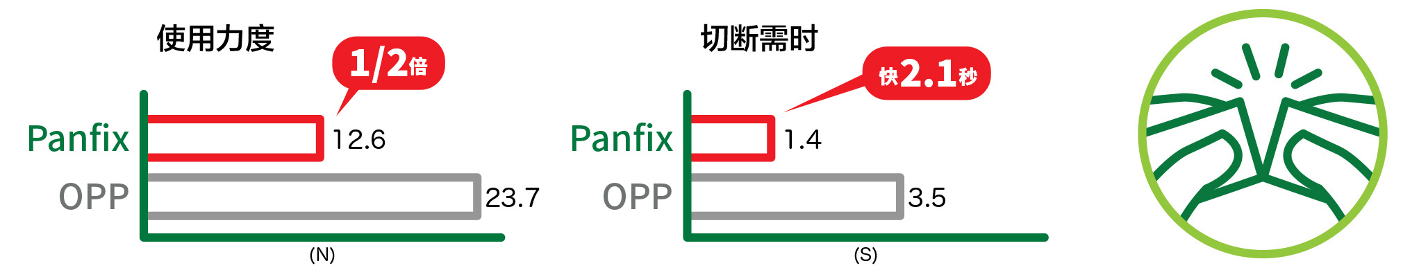 以零售店为胶袋封口作比较,Panfix™玻璃胶带比一般OPP胶纸使用少于一半力度,并快 2.1秒完成。